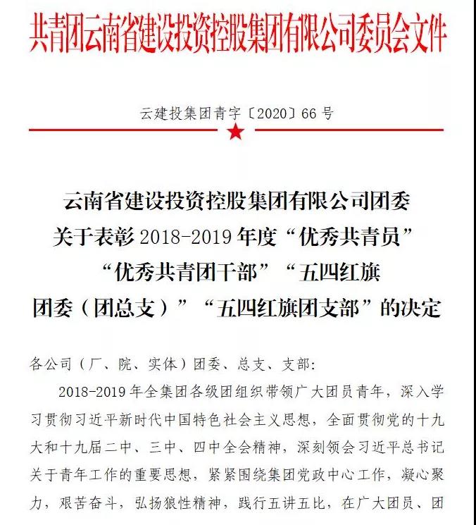 公司團(tuán)委獲評(píng)2018-2019年度云南建投集團(tuán)“五四紅旗團(tuán)委(團(tuán)總支)”